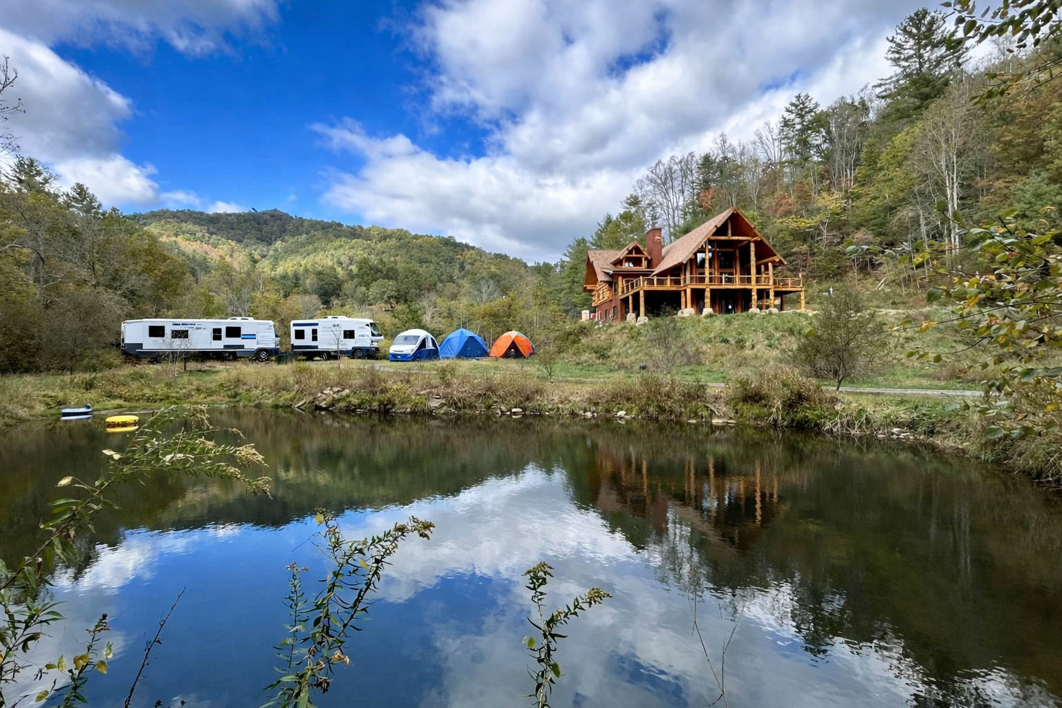 Own an RV, Campervan or Tent? Sleep on the land lakeside with immediate access to the outdoor sauna, hot tub, hiking trails and natural river cold plunge.